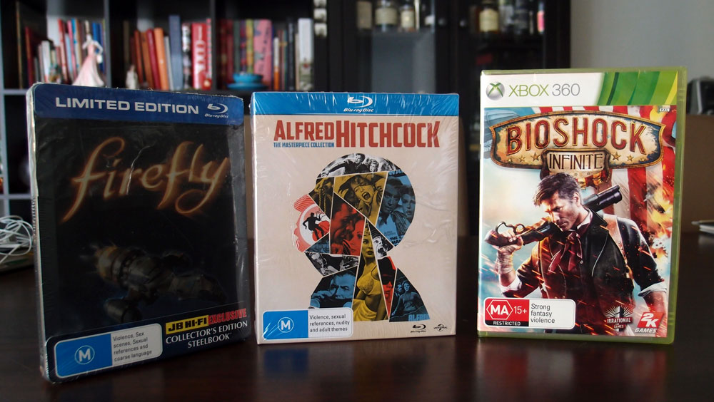 To celebrate getting a job this week, I splurged on the weekend and picked up Firefly, The Alfred Hitchcock Masterpiece Collection and Bioshock Infinite. The Hitchcock set includes: Saboteur, Shadow of Doubt, Rope, Rear Window, The Trouble With Harry, The Man Who Knew Too Much, Vertigo, Psycho, The Birds, Marnie, Torn Curtain, Topaz, Frenzy and Family Plot. 14 movies!