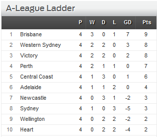 We’re only four rounds into this season but already, there’s pretty decisive gap starting to open up in the competition with three teams undefeated (Mariners, Wanderers, Victory) and three teams yet to register a win (Newcastle, Wellington, Heart). The scary thing is that it looks to me like the undefeated teams have greater scope for improvement whereas the win-less teams seem like they’ll have to pull a rabbit out of a hat to change their fortunes. On the plus side, this is a ten team competition with six finals spots so everyone should have something to play for for the entire season.