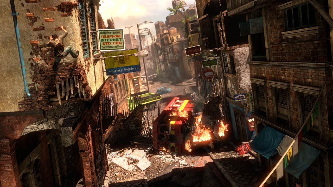 I think animation is as important as pure graphical fidelity and A.I in terms of creating a believable environment and in Uncharted 2, it is simply incredible. I remember the animation being quite polished already in the first Uncharted. It was only a small thing but I remember a scene where Nathan Drake is walking and swimming through a delapitated submarine and being impressed with the animation of the character transitioning from swimming to wading to walking, and little touches such as stooping his head so he doesn’t hit it in the narrow door frames. Uncharted 2 continues this level of animation right off the bat with the train wreck scene where once again, you are simply pushing the avatar upwards and forwards but the character model itself is constantly contorting, stretching and reacting to the environment in a realistic fashion.