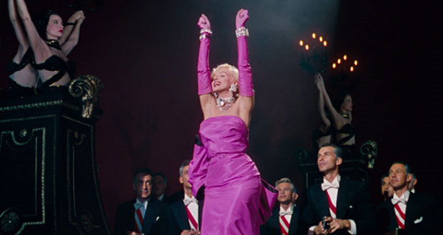 In Gentlemen Prefer Blondes, Munroe plays Lorelei Lee, a beautiful, gold digging showgirl who is looking for a wealthy man to marry. Lee performs with her best friend Dorothy Shaw (Jane Russell) as ‘two little girls from Little Rock’ and after finishing their latest number, Lorelei is proposed to by the smitten millionaire Gus Esmond. Lorelei accepts and although they intend to marry in Europe, their plans are scuppered by Esmond Sr. who suspects that Lorelei is only after his son for money. Lorelei and Dorothy are sent to work on a cruise ship destined for France but Gus is forbidden from going by his father. Gus recruits the services of Dorothy to act as a chaperone to Lorelei but unbeknownst to him, Esmond Sr has hired the services of a private investigator, Ernie Malone, to see if Lorelei remains faithful to Gus.