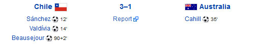 A Chilean attack pinballs around the Socceroos penalty area. Jedinak is unsuccessful in clearing the danger with his header and Sanchez scores a great poachers goal, beating Matt Ryan at the near post.