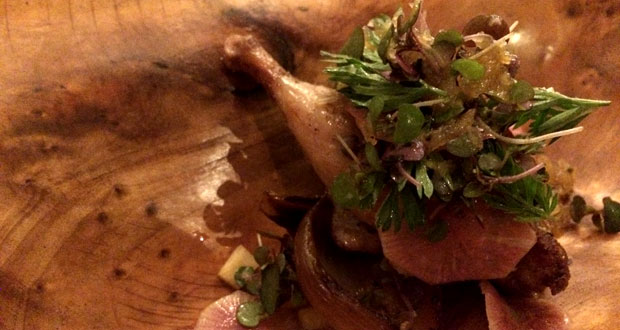 bincho-tain quail, carrot tops, watermelon radish, persimmon
