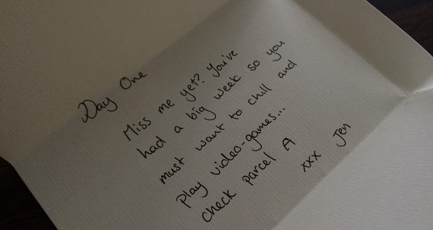 When I got back to Brisbane I came home to an empty apartment. Jen is off to Europe for the next four weeks with her sister Sarah. It’ll be our longest time apart in the five years we’ve been married. Being the caring and considerate kind of person that she is, Jen left me a survival kit to get me through the month. It had some lovely printed photos of the two of us, cooking instructions and some daily notes.