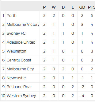 The highlight of the round was a five goal thriller in the Sydney derby in front of a sell out crowd at Allianz stadium with 42,000 fans packing in for a derby that is only two years old. It was a feisty affair with goals galore and plenty of feeling as Vitor Saba was shown red for the Wanderers and Sydney FC’s Sasa Ognenovski earning a suspension in a post-match review. Like the Roar, the Wanderers are struggling to recapture their form of the previous two seasons. After two rounds, last year’s finalists are firmly rooted to the foot of the table with no points.