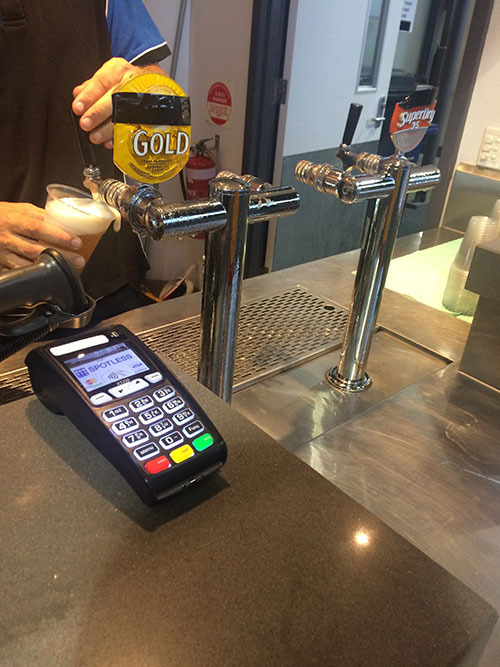 It’s pretty crazy the extent that FIFA go to to ensure that only their selected sponsors are visible at the stadium. Non-sponsor beer has their logo blackened out (see image above) so XXX Gold simply becomes Gold Beer. Crazier still, even the televisions in the stadium that show the game when you’re lining up at the concession stand have the manufacturer logo blacked out. Can’t have Sony TVs on display when Samsung is a major sponsor.