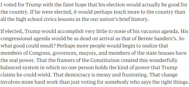 I think an article on the Guardian which interviewed some of his supporters has come the closest to hitting the nail on the head. Of course it goes without saying that there is a massive number of racist, old, disenfranchised white people that form the core of his support. But there are others who are knowingly, actively and complicity voting against their self interest. And for many of those people they are doing so out of desperation.
