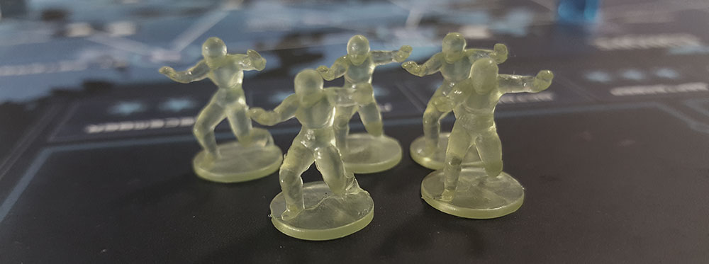 About two rounds into the game…BAM! We triggered it. We learned that the incurable virus has mutated into COdA 403c and that the infected people in the cities have begun developing translucent skin and have transformed into rage filled monsters known as The Faded. See-through zombies! The game replaces the black virus cubes with Faded figurines. Finishing a round in a city overrun with Faded means your character picks up a ‘scar’ wound.
