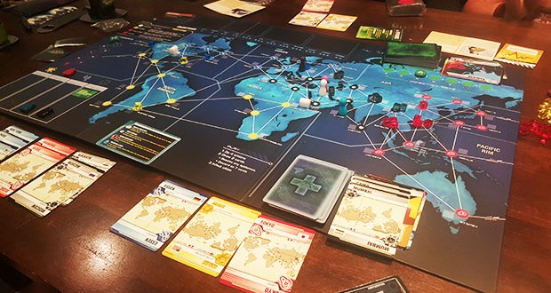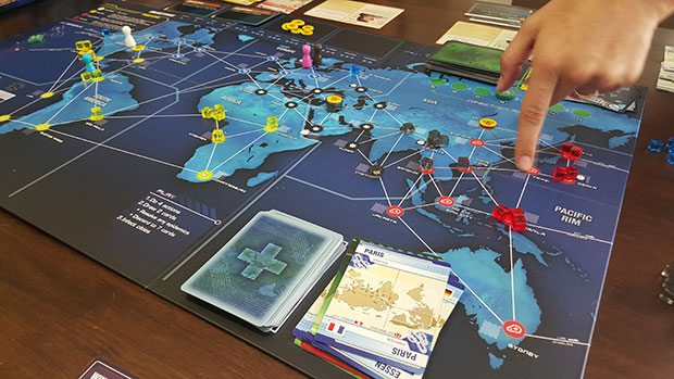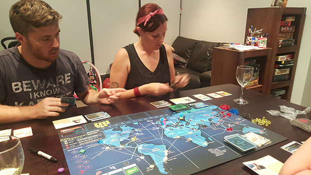 The first game plays pretty much like the vanilla edition of Pandemic. In our team of four, three have very distinct roles designated to them. As the medic, Edo is the ‘healer’ who can quickly clear cities of infection. As a researcher Jaden can quickly trade and accumulate research cards so he finds the cures as quickly as possible. Jen can move other players as the dispatcher so she acts as the conduit when we need to move someone across the globe quickly. Jules was a generalist and contributed equally to curing and researching.