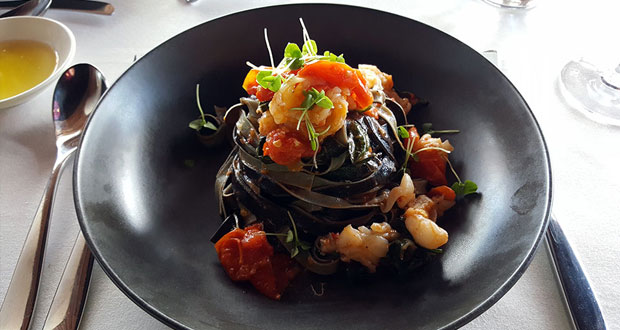 Tagliolini Black and white long pasta, Moreton Bay Bugs, cherry tomatoes, chilli, basil.