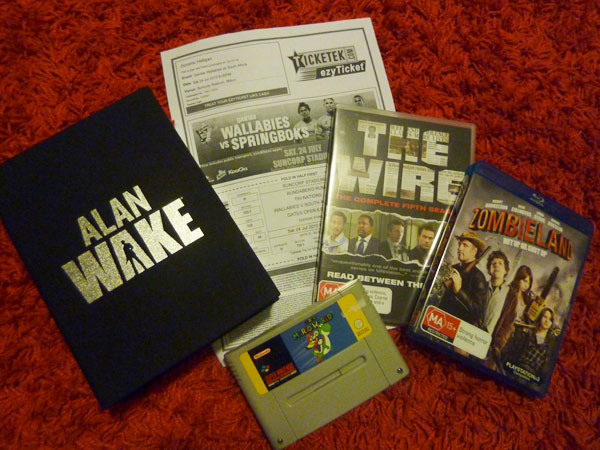 The Wire Season 4 & 5, Tickets to the Wallabies vs Springboks (halfway line), Zombieland (BluRay), Super Mario World (1991) and the new Alan Wake book. All up, a pretty sweet haul for my birthday. Not to mention a champagne breakfast served up by Jen.