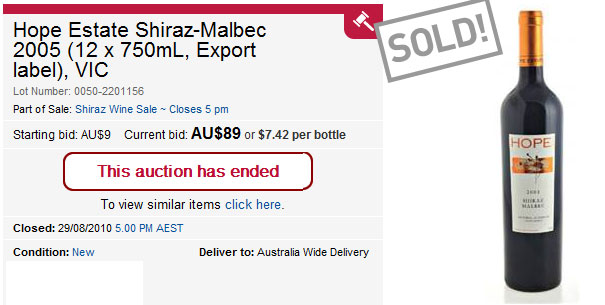 We’ve had some friends recommend that we get onto Grays Online, an Australian auction site, for a while now and this weekend Jen and I finally got on the bandwagon. 12 bottles of Hope Estate, which normally retails for $38 a bottle, ours for the princely sum of $7.42. Soooo good.