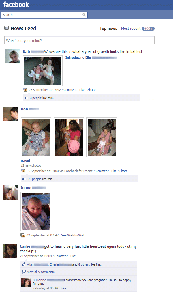 I’m sure it’s going to be me and Jen doing the same thing one day but until such a time comes, I’d love to know if there is a way to filter babies out of Facebook. What I find is that baby photos and baby-related status updates always attract the most number of comments and ‘likes’ therefore they end up clogging up the Top News feed for days and sometimes weeks at a time. I don’t even mind baby photo updates. I just don’t need to see the same ones all the time.