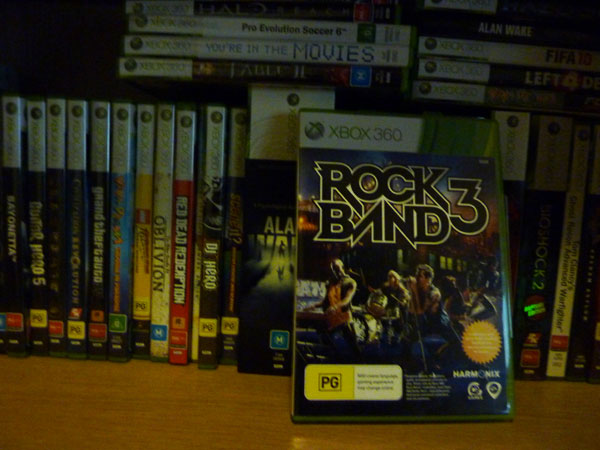 After three long years of waiting, Rock Band 3 was finally released instores today. Jen was nice enough to pick up a copy of the game for me after work. It’s the sequel to my favourite game of the past decade or so and as co-operative video games go, there’s nothing Jen and I enjoy more than unwinding for an evening session with this game. Jen does the vocals, I play guitar.