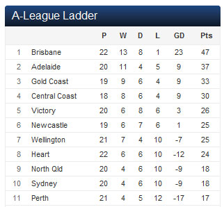 So the Roar won their game and Adelaide United lost theirs. What about the third and fouth placed sides? Gold Coast United were scheduled to play the Central Coast Mariners but the game was called off due to poor conditions after twenty minutes, with the gaming having to be rescheduled at a later date in an already packed fixture list. The Mariners in particular are already down one less game than planned after a match with Newcastle was called off earlier in the season and has yet to be played.