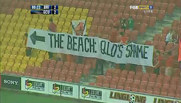 The second half began in entertaining fashion: some local Brisbane supporters, the River City Crew, unfurled a giant banner reading ‘<- THE BEACH: QLD’S SHAME’ before carrying it over right next to the pocket of United supporters in the corner of the stadium. It took a good five minutes before the security guards stopped laughing and decided that they should probably take the sign away.