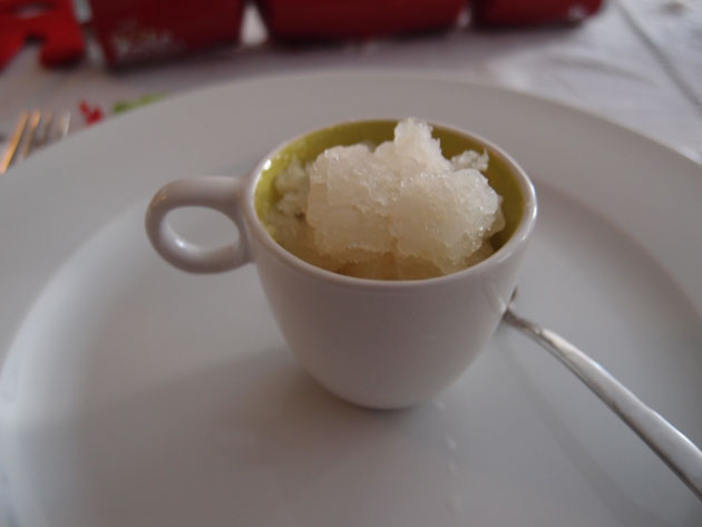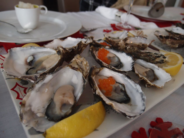 Oysters four ways – lemon and ginger granita, red wine vinegar and shallots, salmon caviar and nude