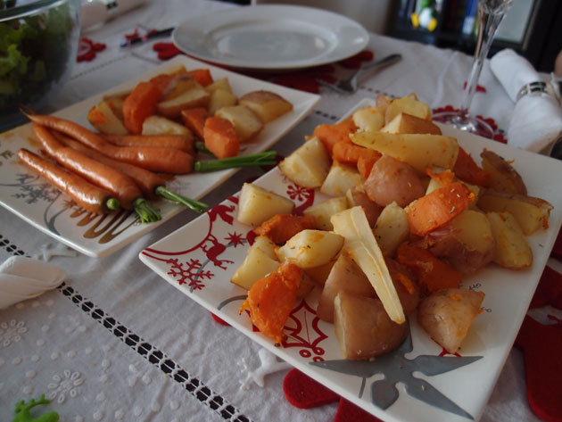 Roast turkey with cranberry and pistachio stuffing, served with roasted vegetables and honeyed dutch carrots