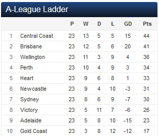 Meanwhile the Central Coast Mariners lost 1-0 to Melbourne Heart. At one stage, the Mariners had the league stitched up and were leading the table by fourteen points. One win in five games means that they lead the Roar by just 3 points now with 3 games to play. The race for the premiereship is very much alive.