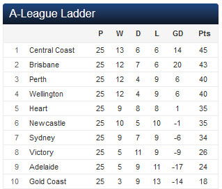 The Brisbane Roar drew at home 1-1 to 9th placed Adelaide United on the weekend. Meanwhile the Central Coast Mariners lost 1-0 to Perth so with 2 games remaining, they hold a slender 2 point lead at the top of the table.