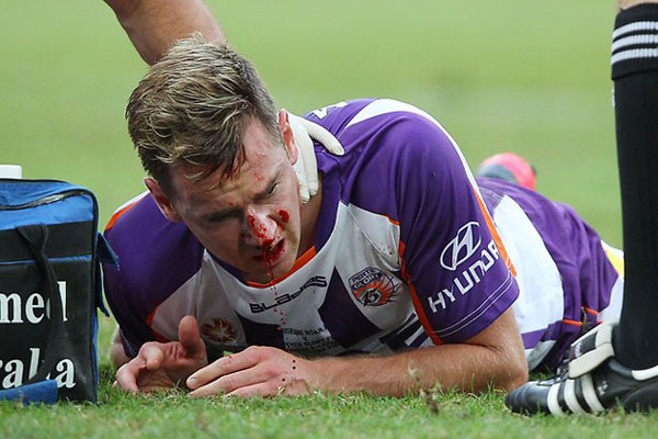 For Perth’s part, they played a disappointingly conservative game. Content to sit back in a Christmas tree formation, they rarely ventured forward and incredibly, they failed to register a single shot on goal in the entire game. The official stats registers two shots on target but having watched the replay, I believe they are counting two crosses that goalkeeper Michael Theoklitos snatched up. Their striker Shane Smeltz may have scored eight goals during the finals but the Roar marked him out of the game. I was impressived with his tenacity however. He copped an accidental elbow to the face from Roar captain Matt Smith that broke his nose. He ended up playing for another sixty minutes wearing a Hannibal Lector style mask to hold his face together. After the game he required fifty stitches and had to have plastic surgery. What a trooper!